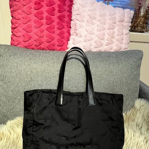 Vintage Prada skulderveske med stein. Materialet er nylon, håndtaket er skinn men har veldig mye riper og slitasjer.