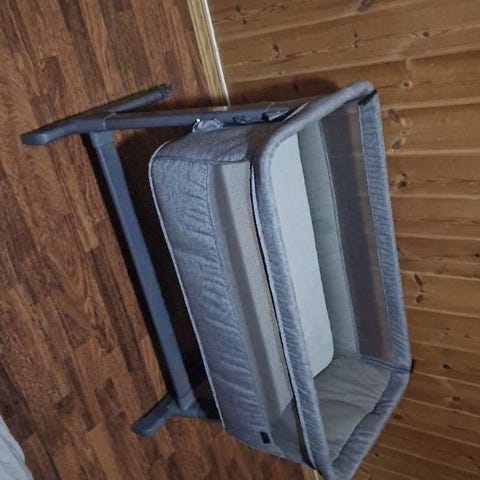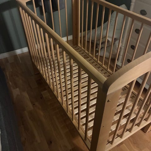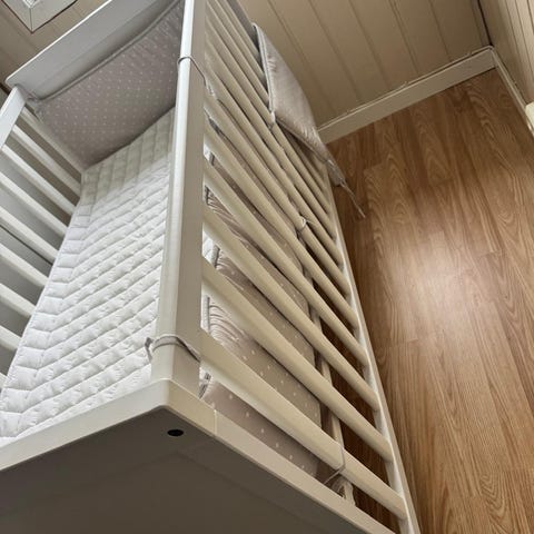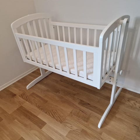IKEA vugge babyseng laget av hvitt tre. Passer for nyfødte og små babyer. Designet for å gi en trygg og komfortabel soveplass i hjemmet.
