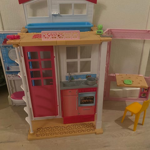 Barbie Lekesett i rosa farge med bærbar design. Lekehuset åpnes for å avsløre innredede rom inkludert stue, kjøkken og bad. Inneholder små møbler og detaljer som bord, stoler, vask, toalett og speil. Passer for barn som liker rollelek og fantasifull lek.
