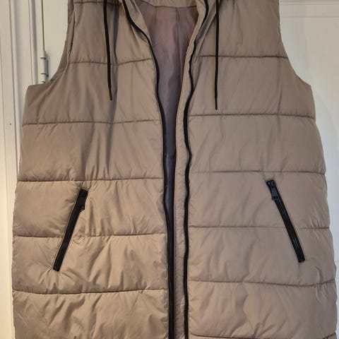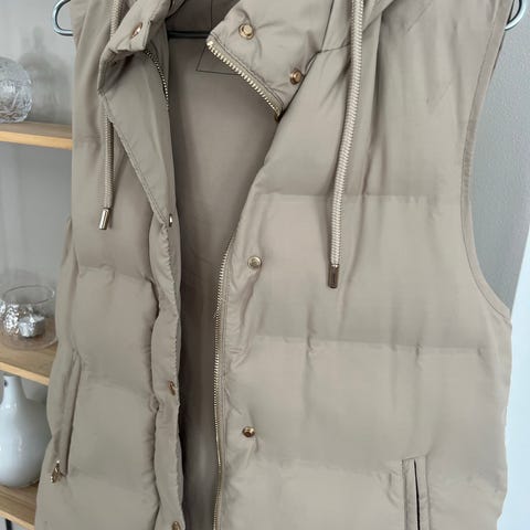 Zara vest i beige farge, størrelse S for kvinner. Laget av syntetisk materiale med polstret design. Vesten har glidelås og trykknapper foran, samt hette med snorjustering. To utvendige lommer med glidelås. Egnet som ytterplagg for kjøligere vær.
