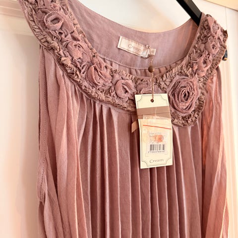 Kjolen har et blomstermønster i blonde og en dekorativ V-utringning med detaljert kant. Materialet består av blonde med et innerfôr, og den har glidelås bak for lukking. Designet er tilpasset kvinner og egner seg til formelle eller spesielle anledninger.