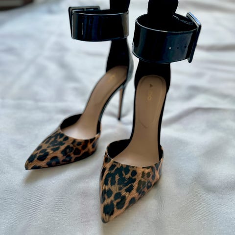 Sandal-lignende sko med hæl i lakkeffekt. Detalj med bånd foran. Avrundet tupp. I str. 38. Helt nye, aldri brukt. 450kr.