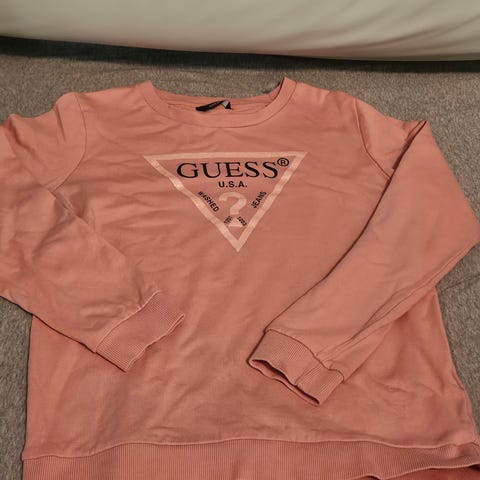 GUESS hettegenser for jente i størrelse 146, fargen hvit med rosa tekst. Genseren har hette og er laget i et mykt materiale egnet for barn.