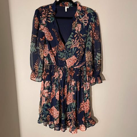 Stoffet har to lag: et stretchy “tube”-kroppsparti under, og chiffon som ligger over skuldre/ermer for den svevende, nesten cape-aktige looken. Sitter fint på L og har godt med stretch i skjørtet.