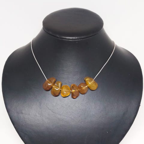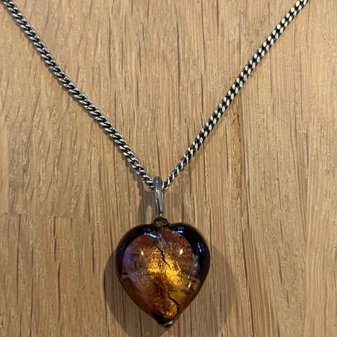 Halskjede i gullfarget, rustfritt stål med et ovalt, håndlaget anheng i resin. Anhenget inneholder tørkede planter, blomster sopp fra naturen. Den ovale rammen har en rustikk farge.