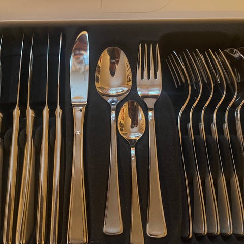 Hardanger Bestikk bestikksett i rustfritt stål. Settet inkluderer forskjellige skjeer i varierende størrelser, egnet for kjøkkenbruk og servering.