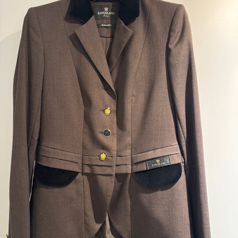 Helt ny, aldri brukt, lappen henger fortsatt på. En av de første modellene til stevnejakkene til Kingsland i ull. Kingsland Classic Collection ridejakke for dame i størrelse XL. Jakken er navy blå med den ikoniske rødt og hvitt krage. Den har gullfargede knapper og kommer med ekstra knapper. Wool blend. Vil si den er ganske liten i størrelse til å være en XL
