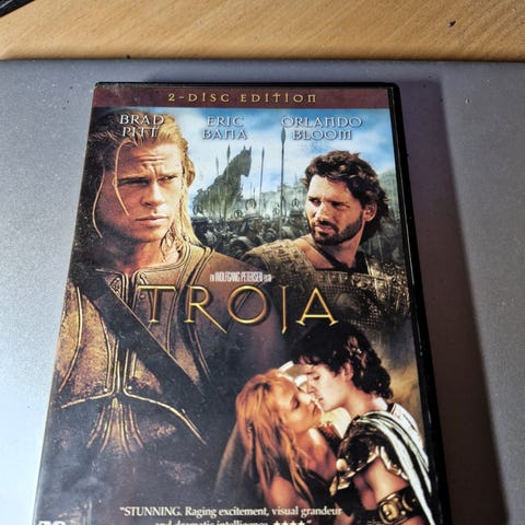 DVD-utgave av filmen Troja, med skuespillere Brad Pitt, Eric Bana og Orlando Bloom.
