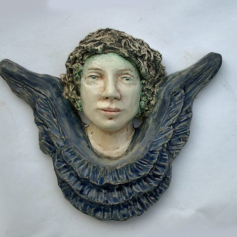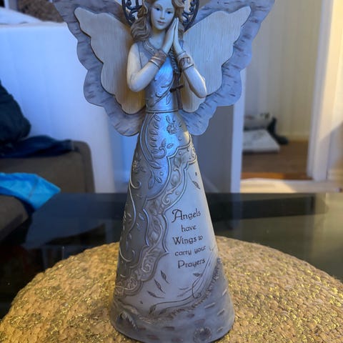 Vakker englefigur i glasert keramikk. Dype bruntoner i kappen og matte, mørke vinger gir et fint, varmt uttrykk. Figuren er hul inni og har modellnummeret «8072–3» risset inn under.