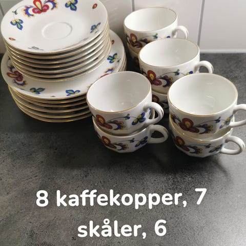 12 suppetallerkener, 4 desserttallerkener, 1 stort rundt fat, 5 ovale serveringsfat i ulike størrelser, 1 salt og 1 pepperdrøsse, 1 stor suppeterrin, 2 firkantede serveringsfat, 3 tekopper med skåler, 4 frokosttallerkner, sukkerkopp og fløtemugge.