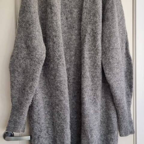 Lang sort cardigan med fine sølvknapper. Har litt ull og alpakka i seg. Veldig varm og komfortabel🖤