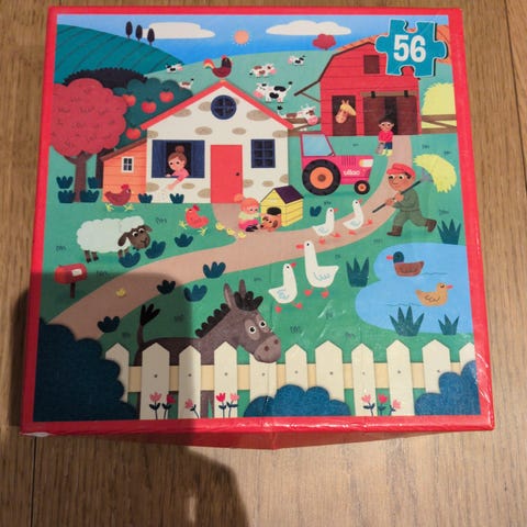 Treleker barn puslespill med gårdsdyr motiv. Puslespillet består av en treplate med utskårede former av ulike gårdsdyr og tilhørende fargerike brikker som passer inn i formene. Materialet er tre, og puslespillet er designet for barn for å utvikle finmotorikk og gjenkjennelse av dyr.