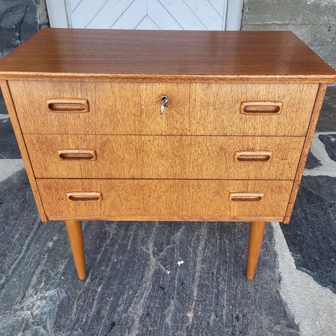 Flott skatthold i teak. Med utslåbar skrivepult og skuffer til oppbevaring.