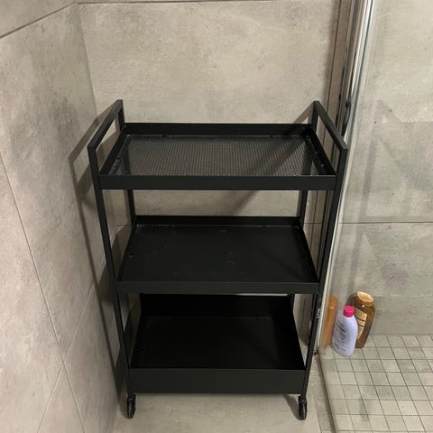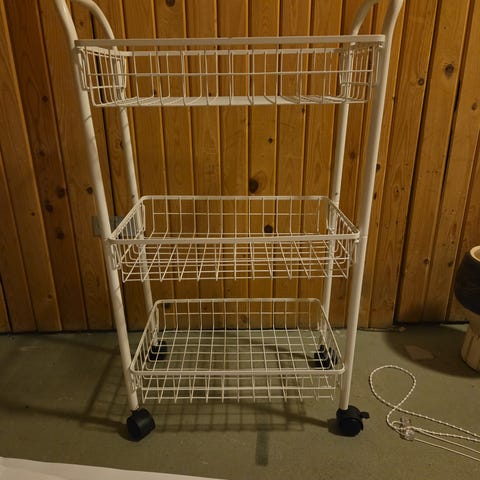 Praktisk og stilren rosa oppbevaringsvogn med tre etasjer. Den har et avtagbart trelokk, perforerte plastkurver og fire hjul.