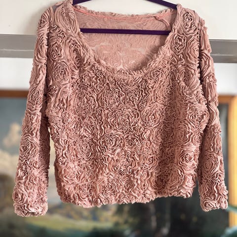 Søt college genser med blonder og pynt. Kamelhårs farget.