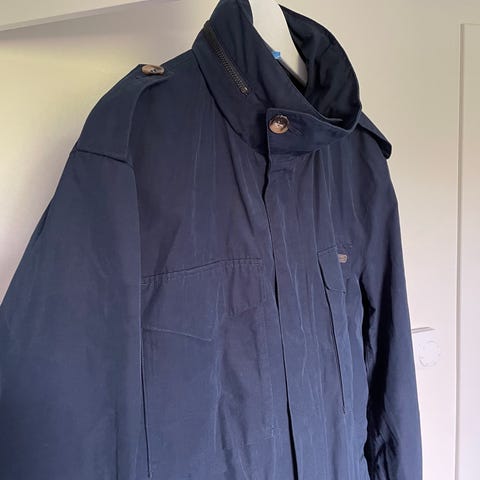 Pent brukt. Uten hette. Litt skjolder på stoffet der knappene er festet. Romslig med mange lommer. Finere i virkeligheten, bildene ble ikke helt bra grunnet lyset.