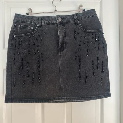 Kjempekult, langt denimskjørt fra Gestuz, i en slags «slitt» sortfarge, i størrelse 40, selges for 600. Meget pent brukt. Kan sende.