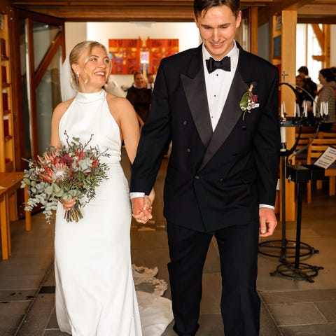 Skredder har justert halsen på kjolen til å bli enda mer båthals, sydd opp brystpartiet noe og justert lengden på kjolen til å passe høyden min med brudeskoene. I tillegg er det sydd inn dansehempe.