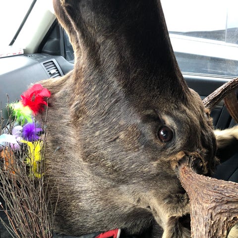 Utstoppet elgkalv i naturlig størrelse med sokkel