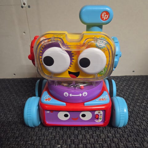 Fisher-Price barneleke formet som en TV med håndtak. Leken har en grønn farge og inneholder bevegelige deler som et lite ur og en dreibar knapp. Egnet for små barn som en tidlig lekefunksjon og motorisk trening.