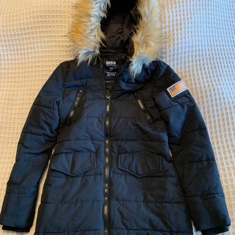Jakken har hette med avtagbar pelskant og flere lommer. Materialet er polstret for ekstra varme. Passer til utendørs bruk i kaldt vær.