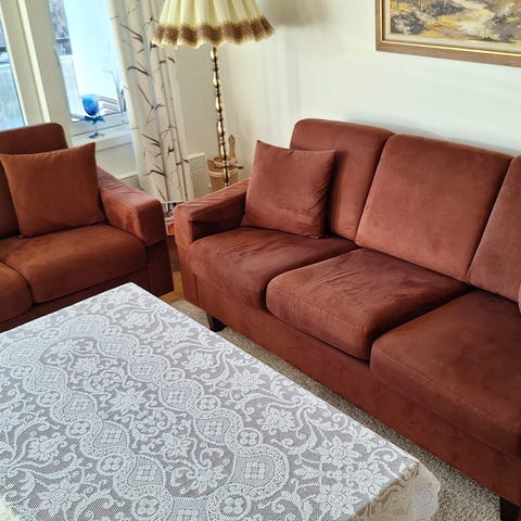 En pen og lite brukt 2 seters sofa fra KA International selges. Fargen er brun, se siste bilde. Må hentes.