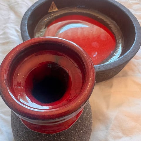 Skålen er laget av chamotteleire med en mørkebrun utvendig glasur og en livlig, blank, rød innvendig glasur, ofte beskrevet som "fat lava"-stil.