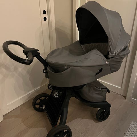 Stokke Xplory barnevogn i brun farge. Følger med en del utstyr som vist på bildene.