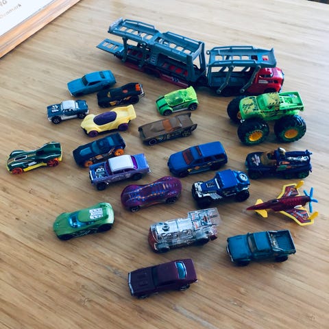 En samling av biller noen er hotweels og de fleste er gamle biler