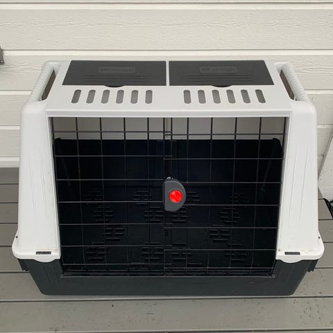 Standard grå hundebur laget av plast med metallgitterdør. Buret har ventilasjonshull på sidene og et håndtak for enkel transport. Inkluderer to polstrede puter, en rosa og en grå med stjernemønster, for komfort. Passer til små til mellomstore hunder.