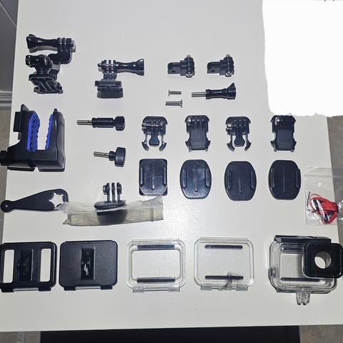 GoPro/Garmin tilbehørspakke med ulike kamerafester, justerbare remmer og etui. Inkluderer brystsele, hodebånd, festeadaptere og beskyttelsesramme i svart materiale. Designet for å feste kameraer sikkert under forskjellige aktiviteter.