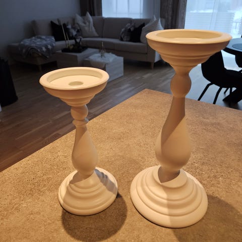 To høye lysestaker for kubbelys, hvitfargete i sement. Har bare stått og samlet støv i noen år. Henholdsvis 30 og 40 cm høye, for kubbelys på max 8.5 cm i diameter.