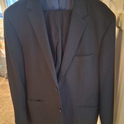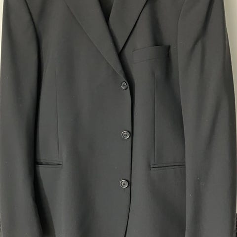 Mørk blå dress, vanskelig å se farge på bilde. Meget pent og lite brukt. Både bukse og jakke er i størrelse 54.