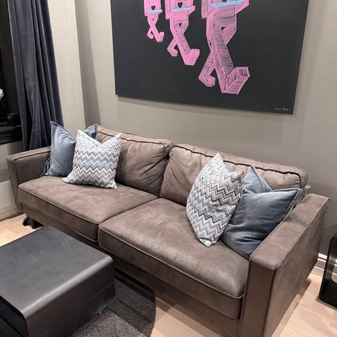 Sofaen er i grei stand.