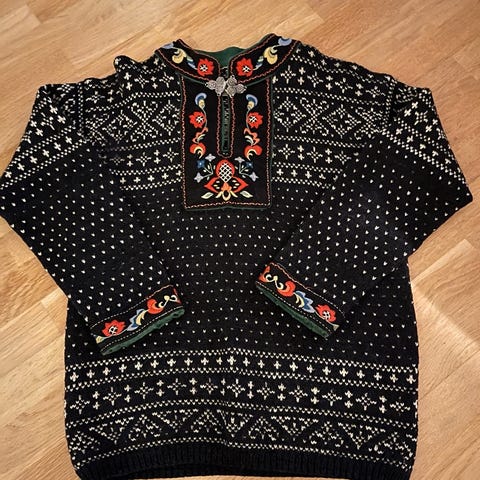 Håndstrikket Setesdal genser med flotte håndbroderte bånd. Genseren er strikket i Peer Gynt ullgarn. Tinn hekte i halsen. Lite brukt. Tilsvarer en 36 str. til dame