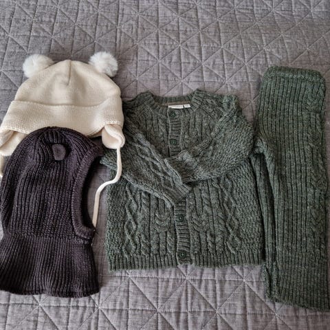 2 par strikket votter og strikket pannebånd