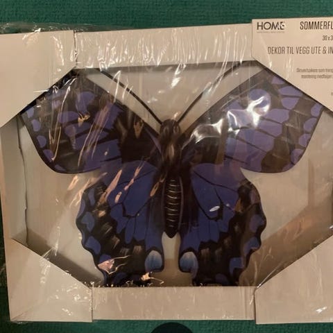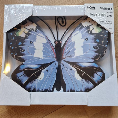 HOME Sommerfugl veggdekor med størrelse 30x30 cm i lys blå farger. Dekorasjonen er beregnet for vegg og innendørs bruk. Flott so dekor i evnt. utestue.