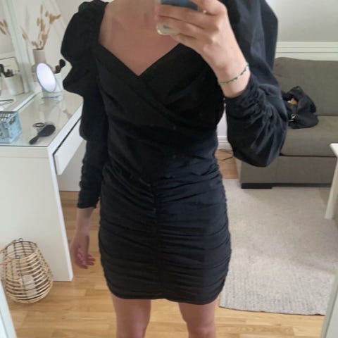 Kjolen har lange ermer og er laget av lett, gjennomsiktig materiale med flere lag og volanger.
