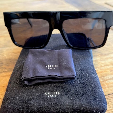 Celine solbriller med stor rektangulær ramme i svart materiale. Brillene har mørke glass og passer for både menn og kvinner. Designet gir god dekning og beskyttelse mot sollys.