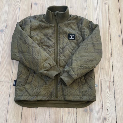 Jakke i størrelse 110, brun farge, designet for gutt. Jakken har hette og glidelås, egnet for barn i denne aldersgruppen. Stor i str, god og varm