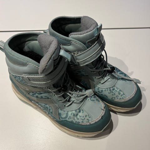 Okaki barnesko for jente i størrelse 35. Skoene er grå med mønsterdetaljer og har borrelås og snøring for justerbar passform. Materialet ser ut til å være slitesterkt og egnet for utendørs bruk.