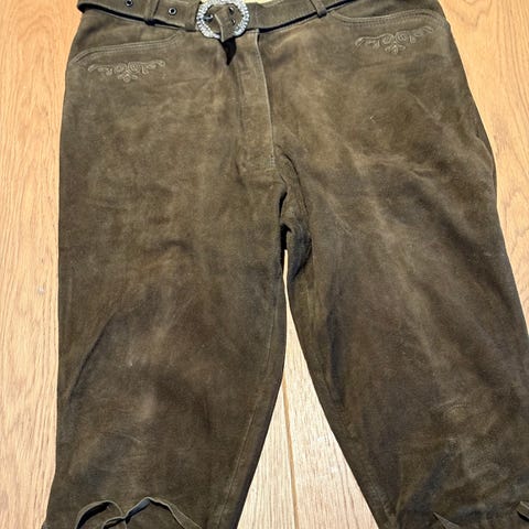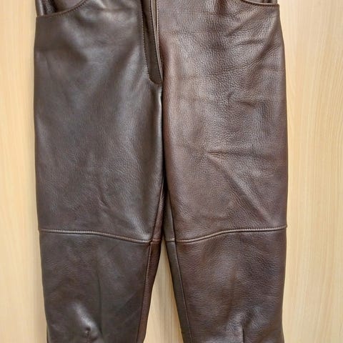 Nickers sydd I skinn med for. 2 lommer foran . Skinnet har rustikt/ ujevn farge. Livvidde 80 cm . Lengde 75 cm.