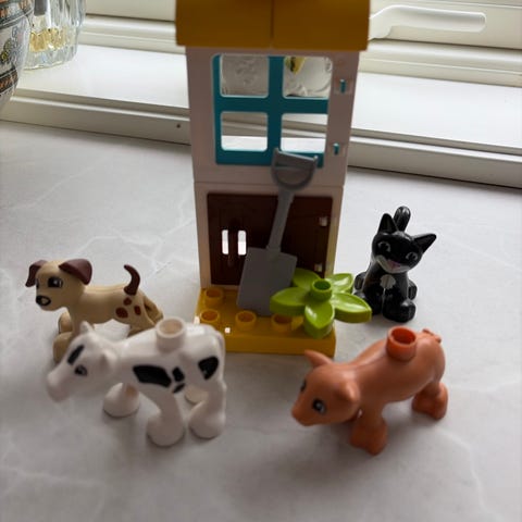 LEGO DUPLO Lekehus. Lekehuset har illustrasjoner av vinduer, trær og møbler, og åpnes for å vise innvendige rom med detaljer som seng, bord og stoler. Laget for barn, egnet for rollelek og utvikling av fantasi. Lite brukt.
