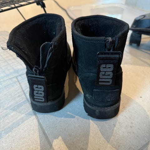 UGG støvler i størrelse 37 for dame. Laget av svart semsket skinn med fôr av mykt materiale for varme og komfort. Støvlene har glidelås på siden for enkel på- og avkledning. Egnet til bruk i kaldt vær. Kule design når glidelåsen er nede.