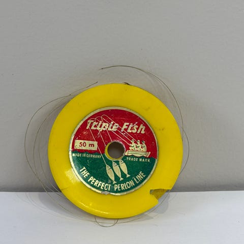 Original Gladding’s “Saline” silkeflueline fra USA, produsert i overgangsperioden ca. 1935–1945. Dette er en ekte vintage silkeline, beregnet for saltvannsbruk, og levert på original plastspole med patentnumre.