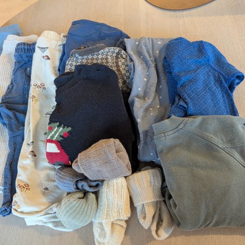 2 bodyer, 1 bukse, 1 flisjakke, 6 par sokker og 1 par votter.