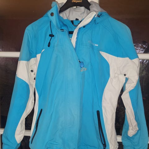 Hvit skijakke med snøslås og turkise detaljer. Nyvasket og pent brukt. Nyprisen på skijakker fra HM er på ca 1200