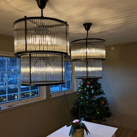 Taklampe pendel med tre hengende lysdråper i metall og glass. Lampen har rund takkopp i gullfarget metall med tre separate nedheng. Hvert pendeloppheng har en slank dråpeformet glasskjerm med dekor inni og gullfarget topp. Ledningene er sorte. Passer som belysning over spisebord, i trappeoppgang eller i andre rom der man ønsker en hengende taklampe med flere lyskilder. Mål på hver dråpe er ca. 35 cm lengde og ca. 5 cm i diameter, total høyde på opphenget er ca. 170 cm.