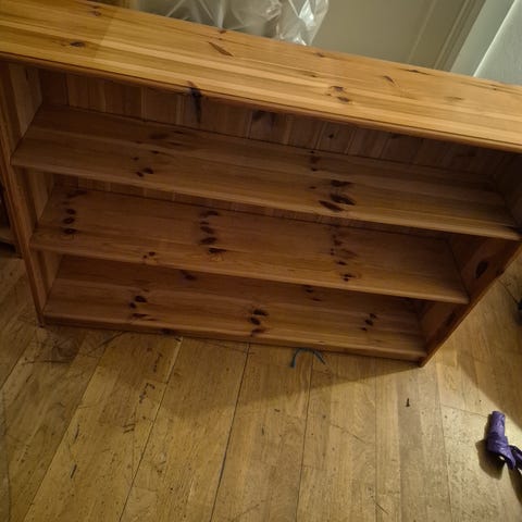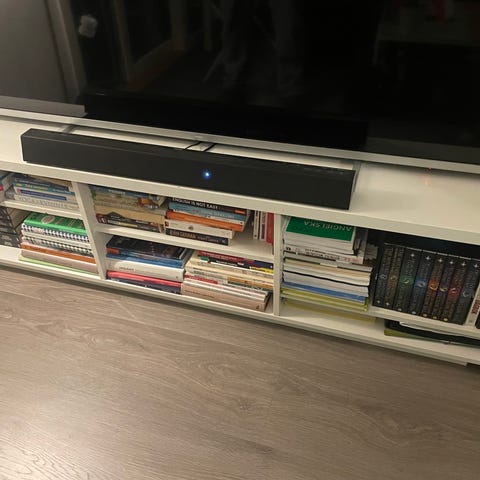 TV benk i tre gis bort mot henting. Hull bak for ledeninger.