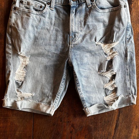 Hollister Denim Shorts i størrelse W30 for menn. Shortsen har en slitt og revet design med frynsete kanter, laget i denimmateriale. Opprinnelig en ripped jeans bukse omgjort til shorts. Passer til uformelle bruk.